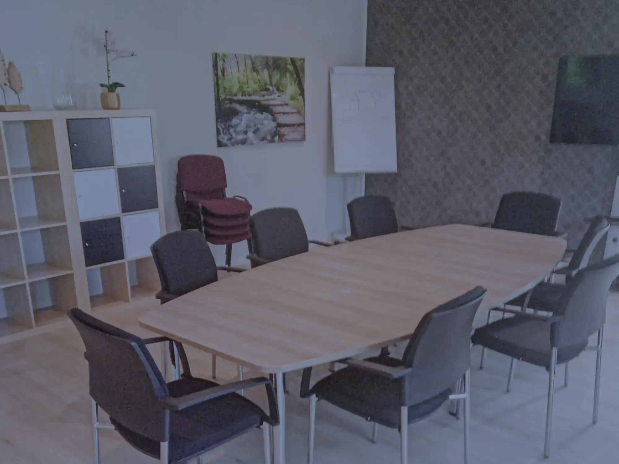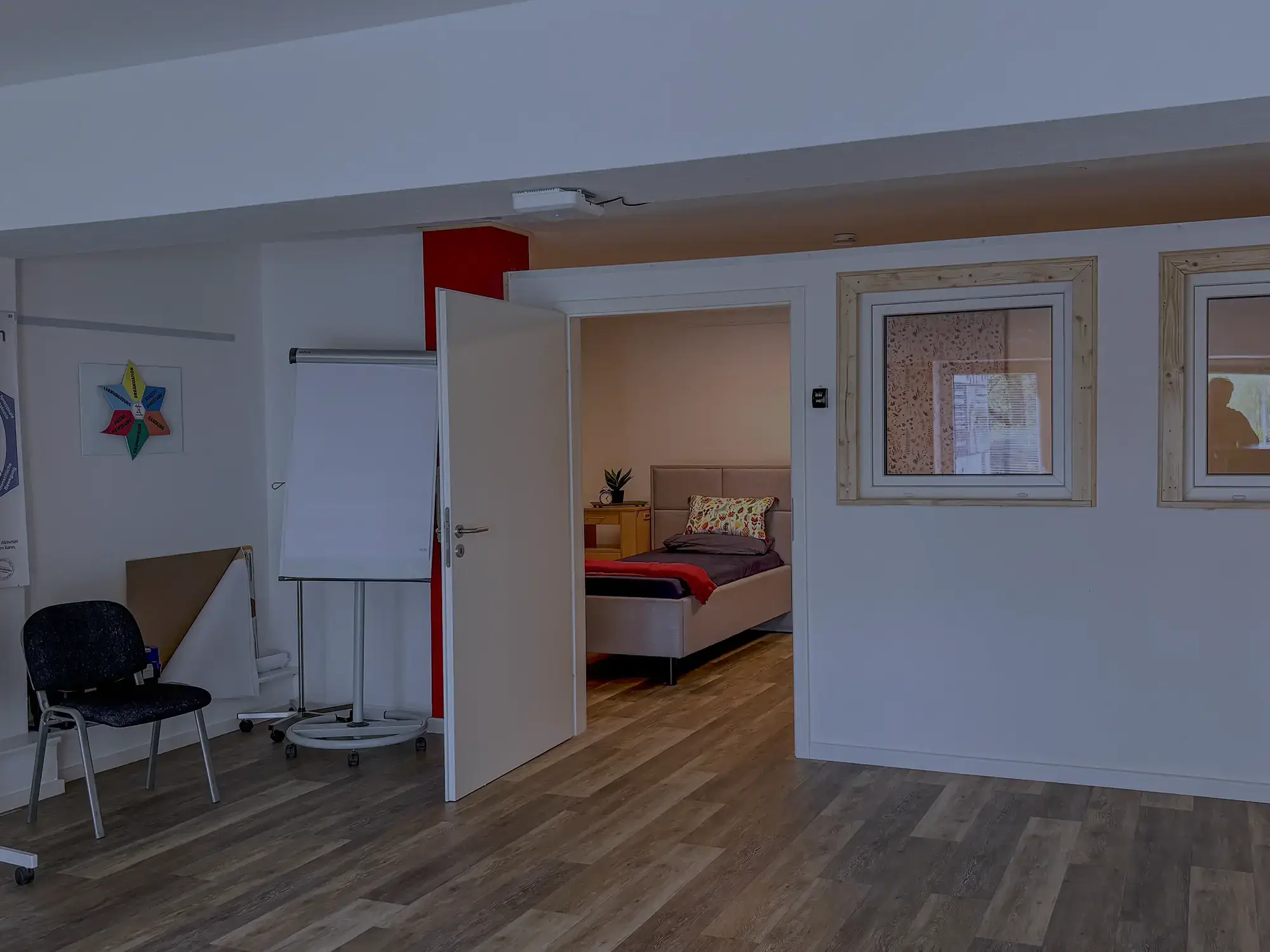 Ausstattung: Flipchart, Metaplanwand, Moderationskoffer. Küchenzeile mit Spüle, Spülmaschine, Kühlschrank, SodaStream und Geschirr/Besteck für bis zu 30 Personen.